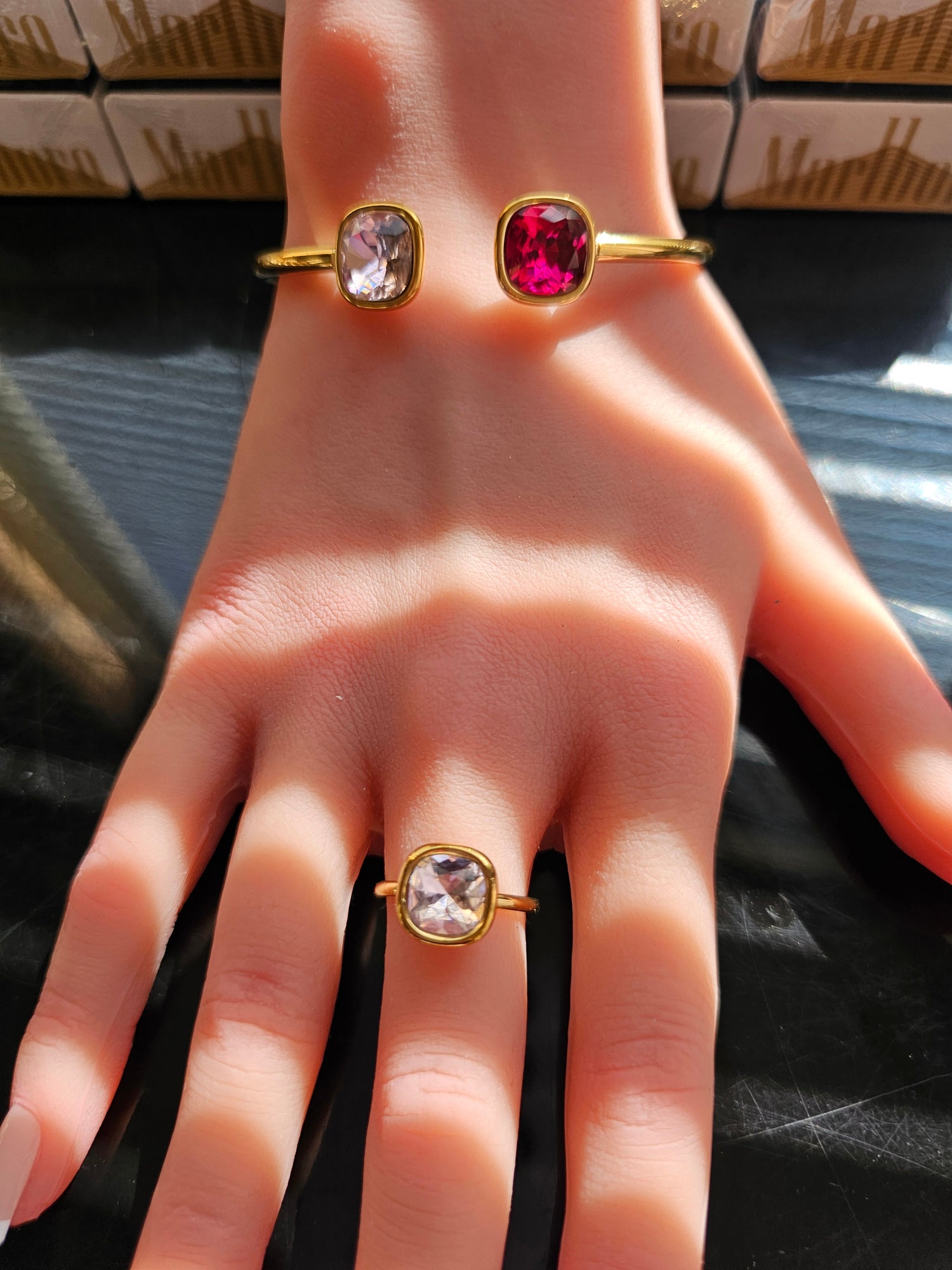 Adoptez un style audacieux avec notre bague 'Prisme Enchanté', en acier inoxydable doré et ornée d’une pierre carrée aux couleurs vibrantes. Déclinée en plusieurs teintes – du bleu océan au rose lumineux – elle s’accompagne de bracelets assortis pour une harmonie parfaite. Conçue pour celles et ceux qui aiment briller avec originalité, cette collection allie finesse, durabilité et esprit contemporain.