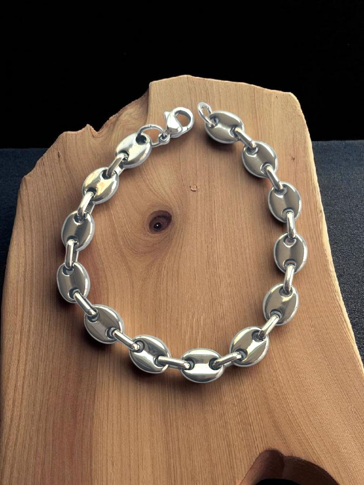 Bracelet chaîne grains de café moyen en acier inoxydable argenté au design élégant et moderne, idéal pour sublimer votre style au quotidien. Chaque maillon ovale poli reflète la lumière avec éclat, apportant une touche de sophistication à votre poignet. Bijou durable, hypoallergénique et tendance, parfait pour un look raffiné et intemporel.