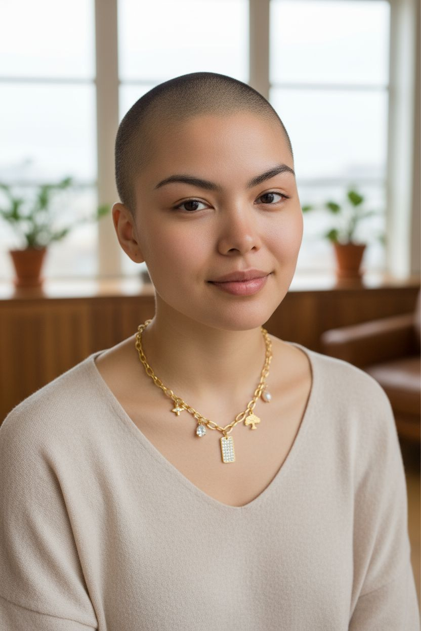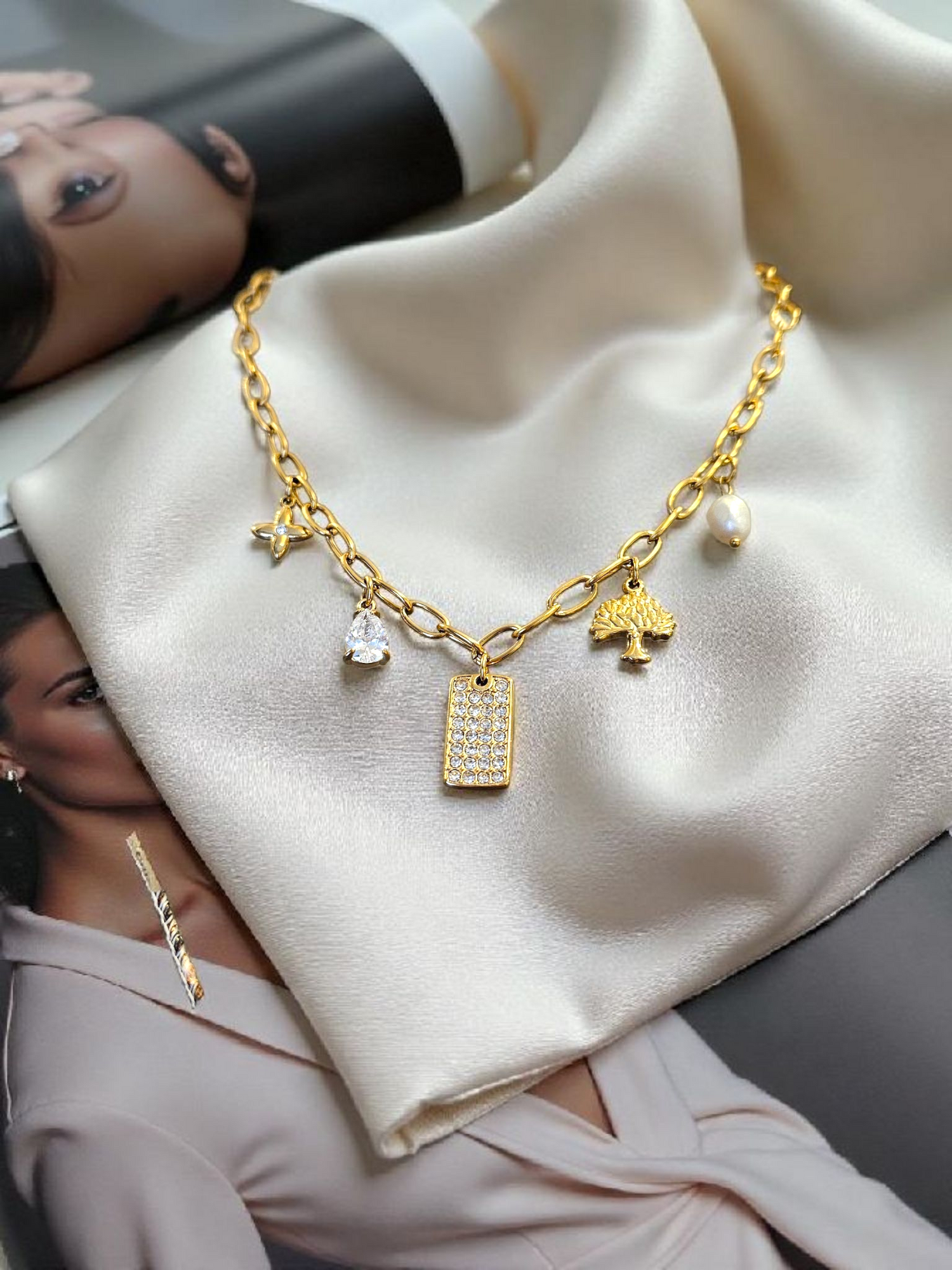 Collier en Acier Inoxydable orné de 5 charms une perle , un arbre, une plaque strass, une goutte d'eau et une fleur